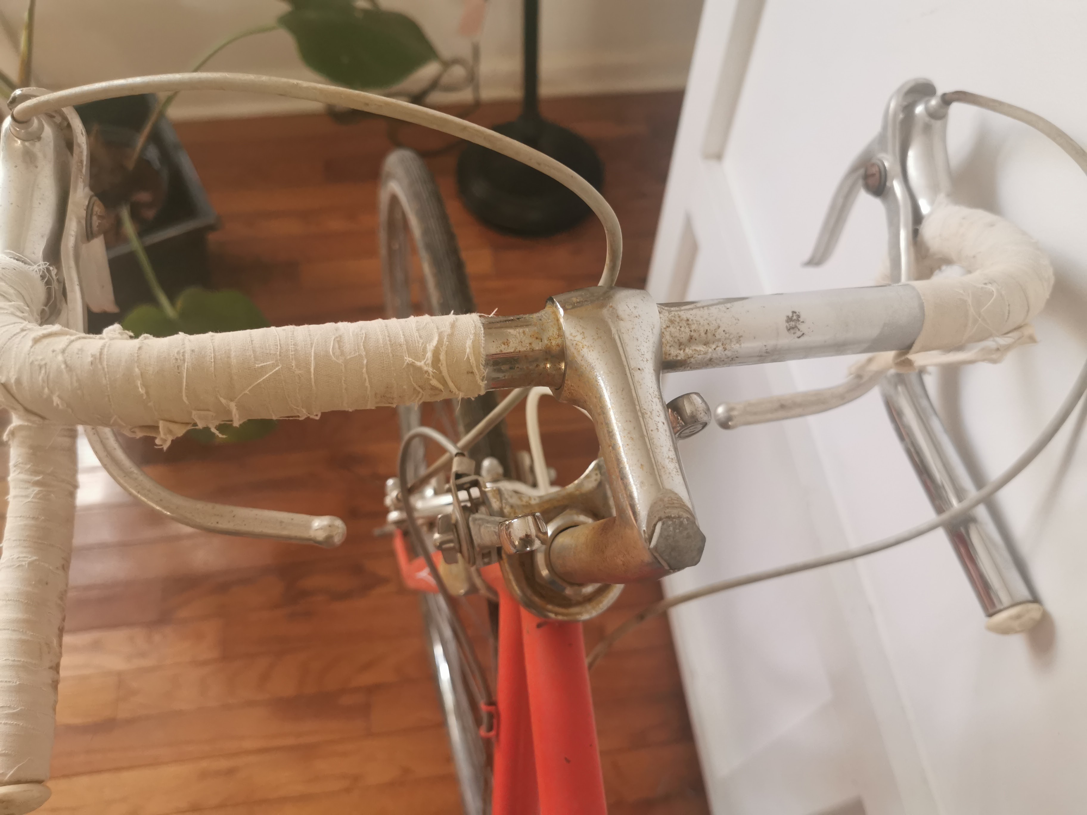 And handlebar tape. I didn’t want the white cloth tape since I’m actually planning to ride this. Wanted something softer. So I got Brooks tape, but used the original bar plugs. Doesn’t look as good as the Brooks plugs, but it stays with the original. Below is before and after.