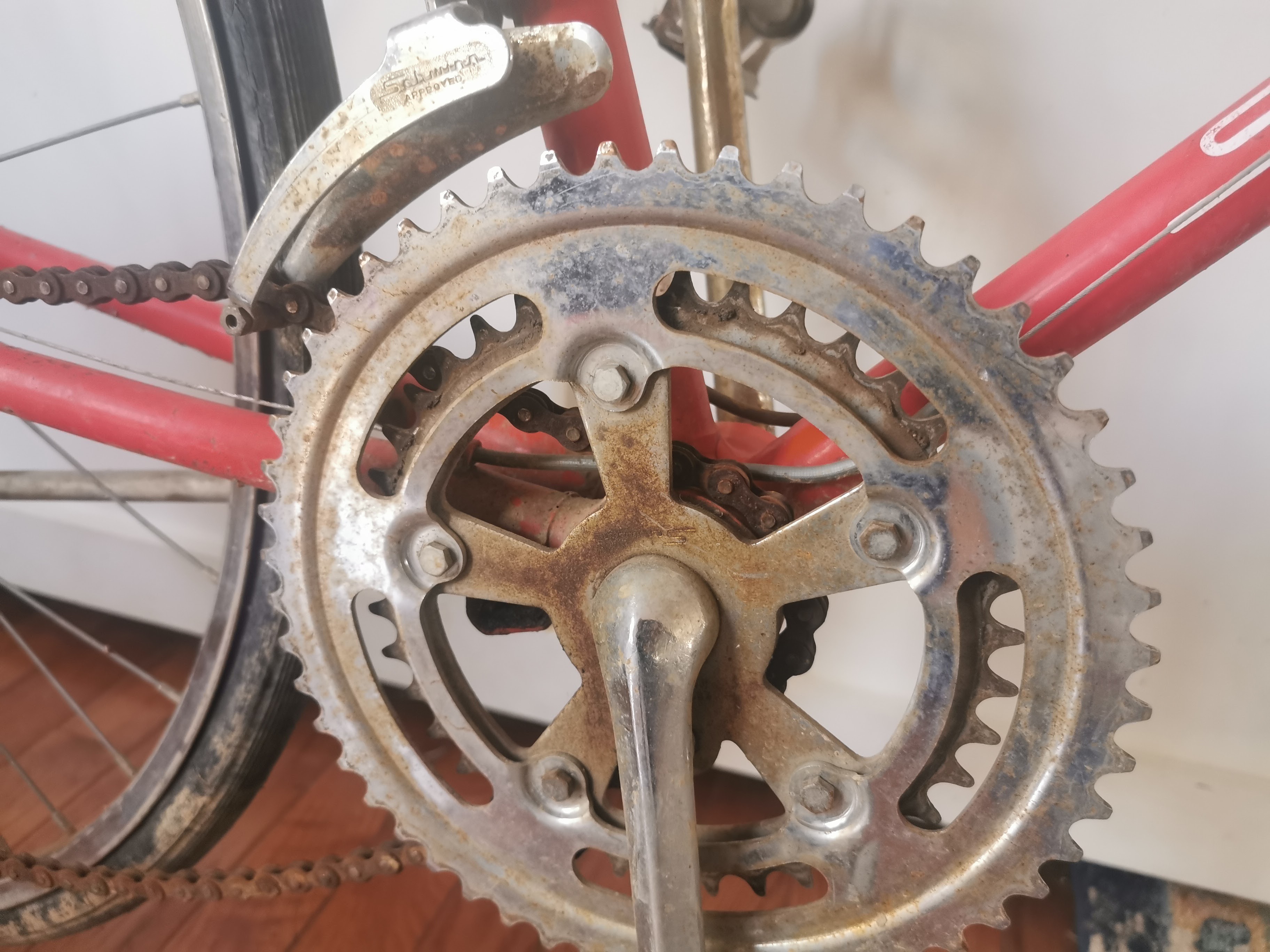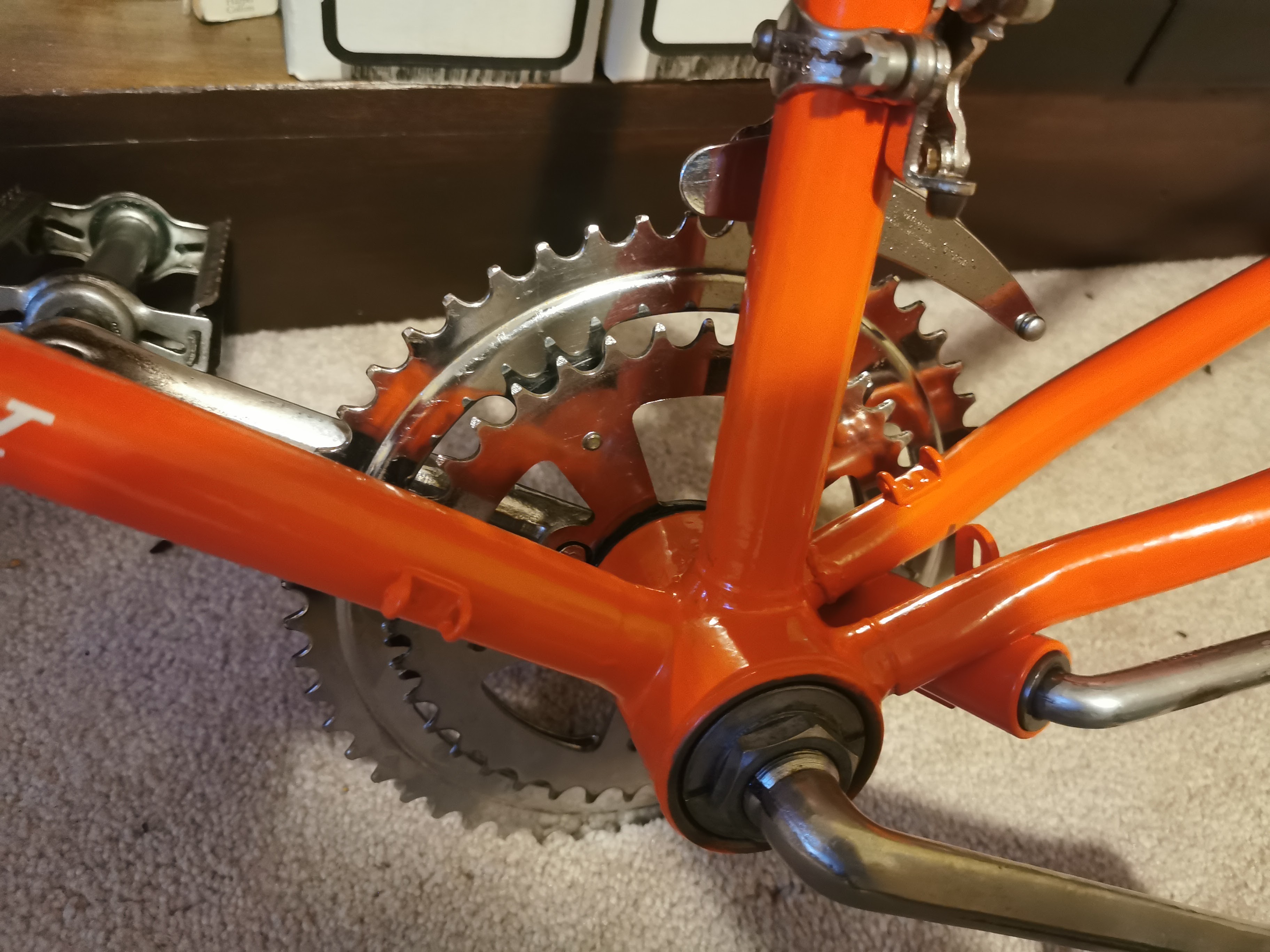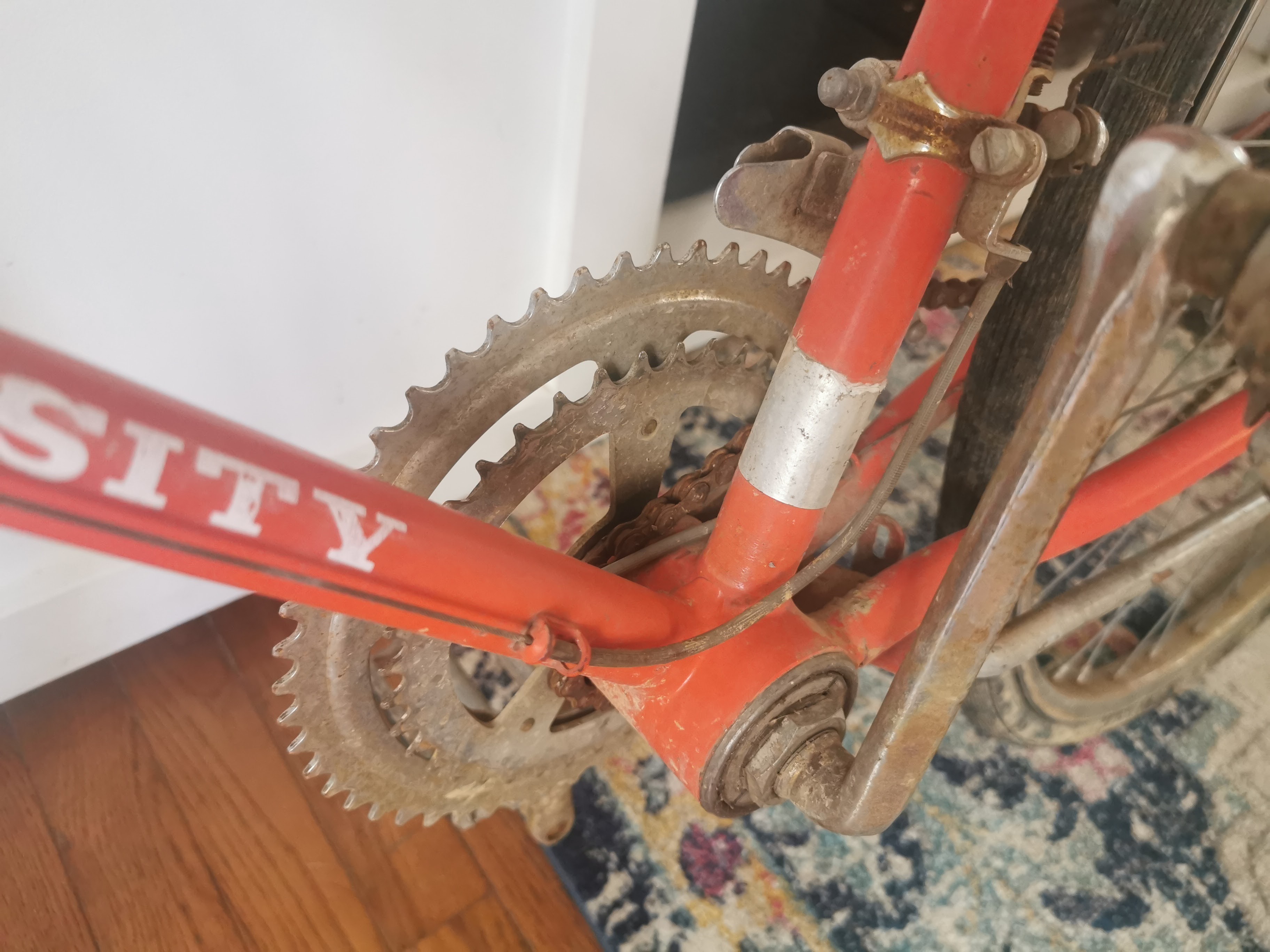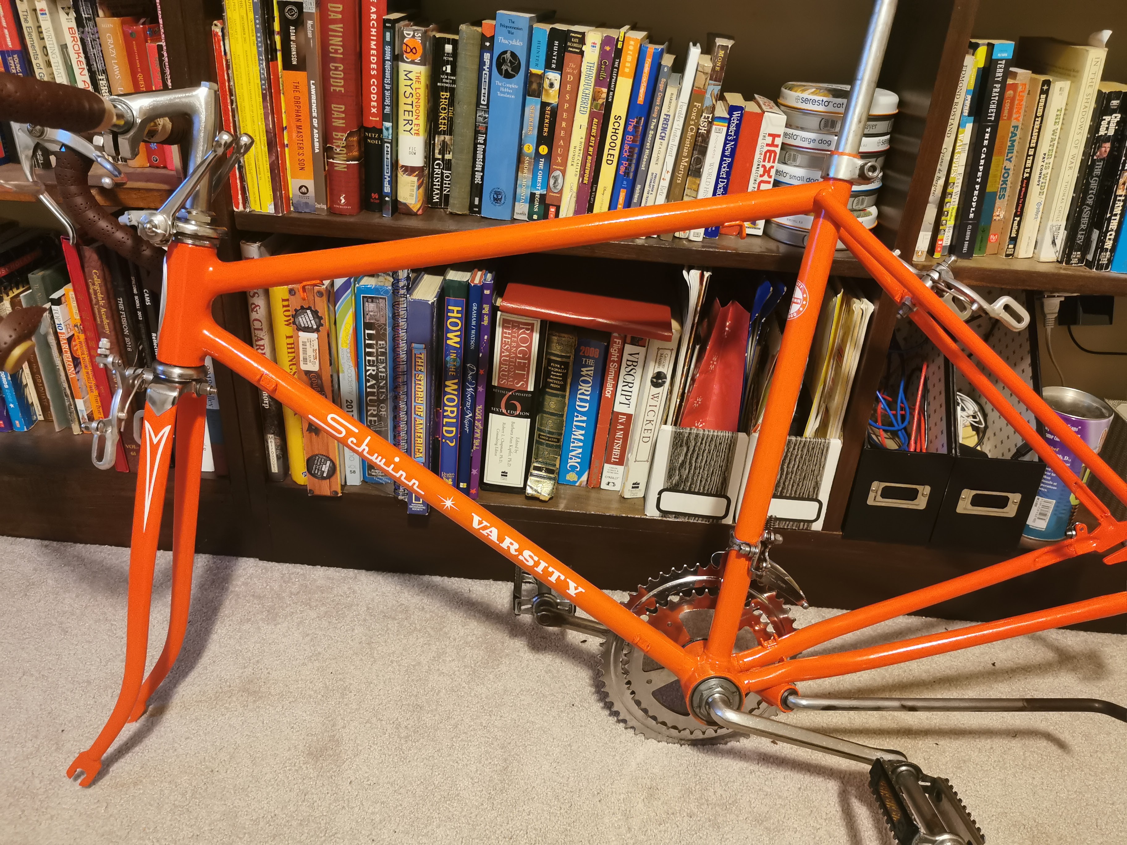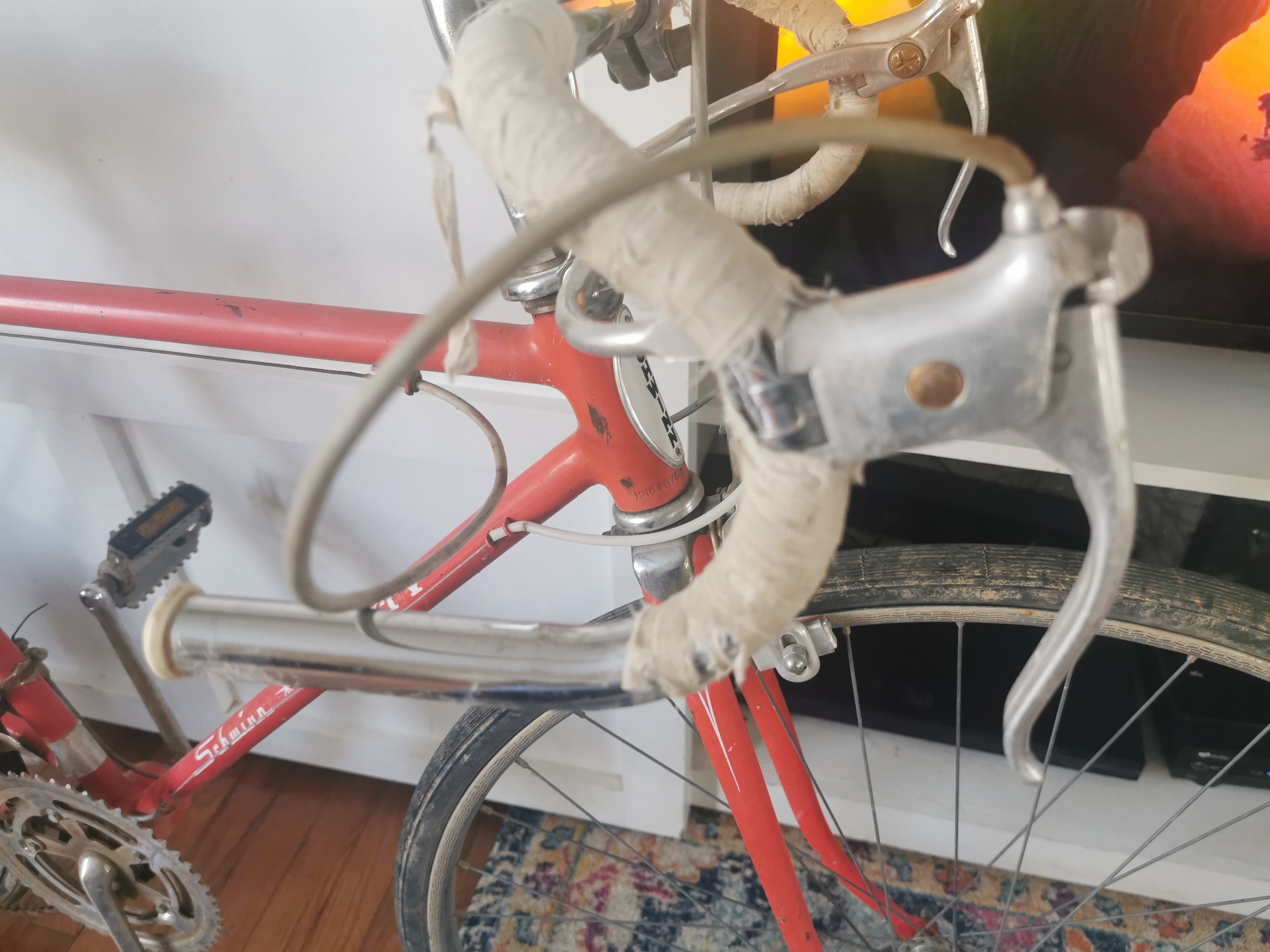 At this point the Varsity is just waiting for cables and the rear tire. I had to wait for about three weeks for a tool to arrive from Greece so I can take the rear flywheel off. And then I’ll take it to the LBS to get it trued. Then I’ll clean it, pack it, and it will be ready to go. Cables are on the way. But here are some pics of the progress TD.