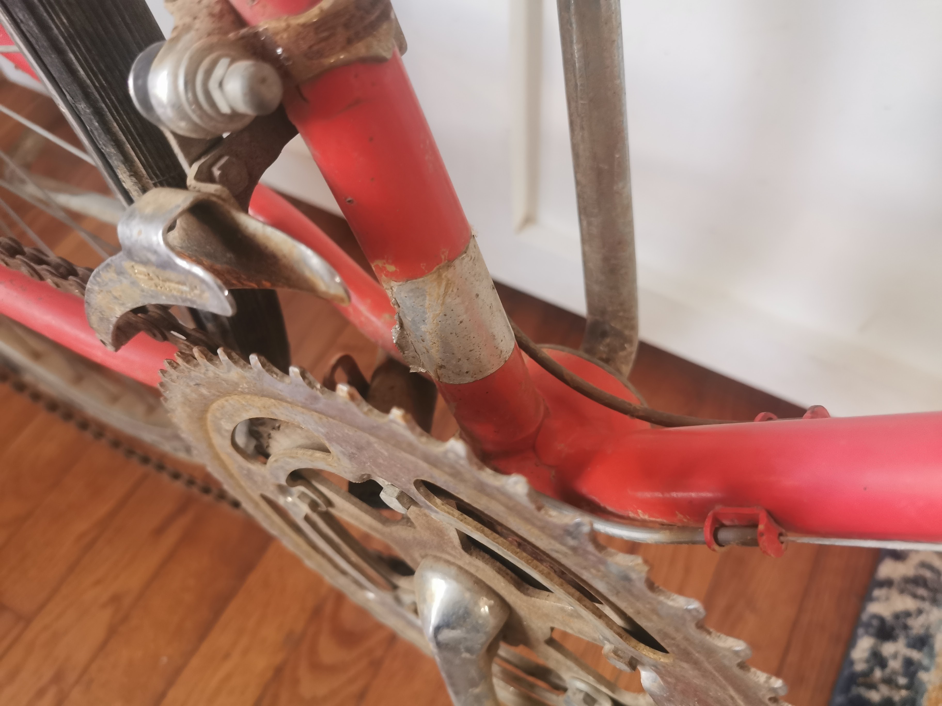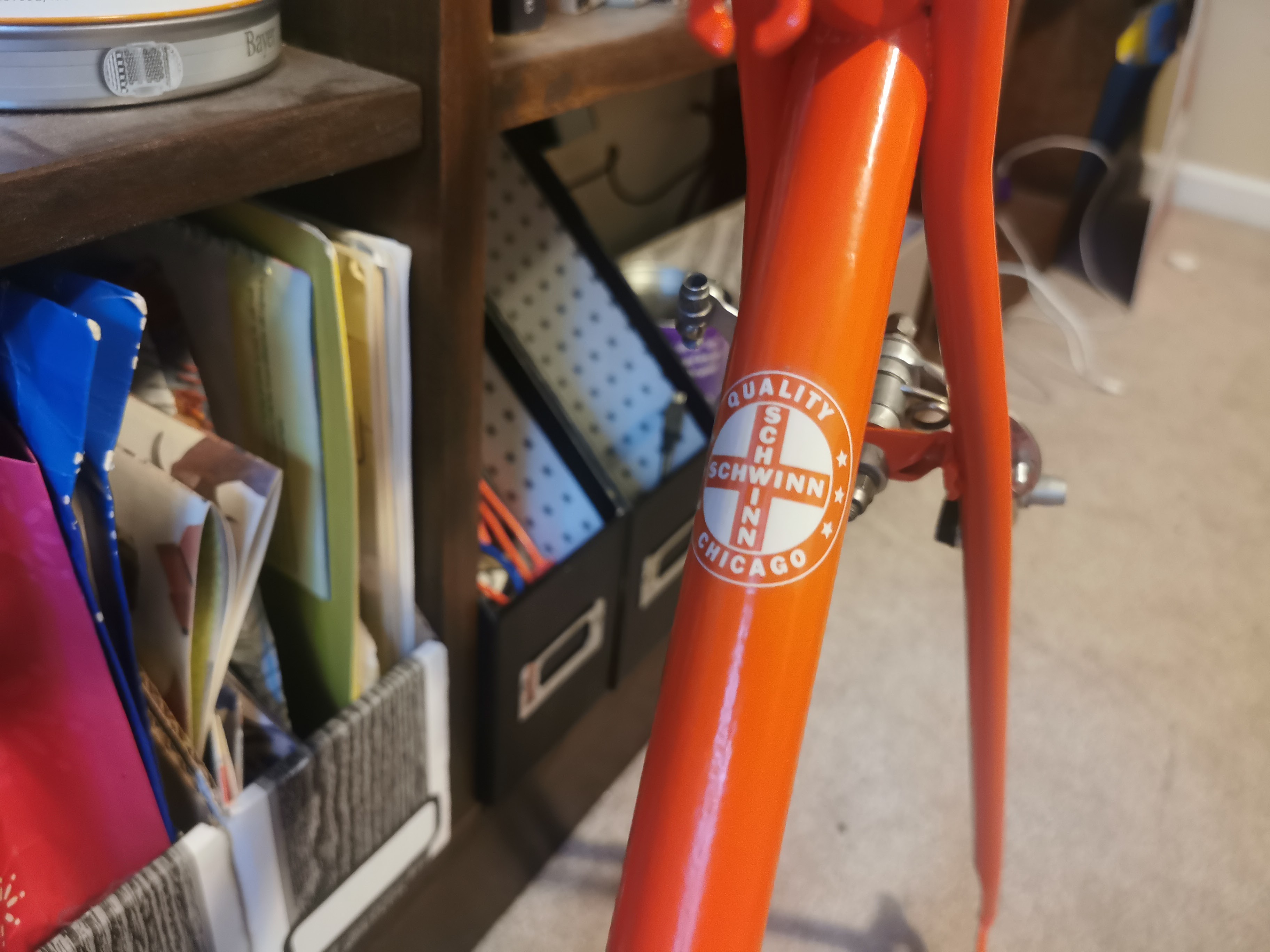 Replaced the decals… these are the best pics I got of the old ones. And below that, the new ones. Got them on eBay. They are water decals, the appropriate kind for fixie restoration projects.