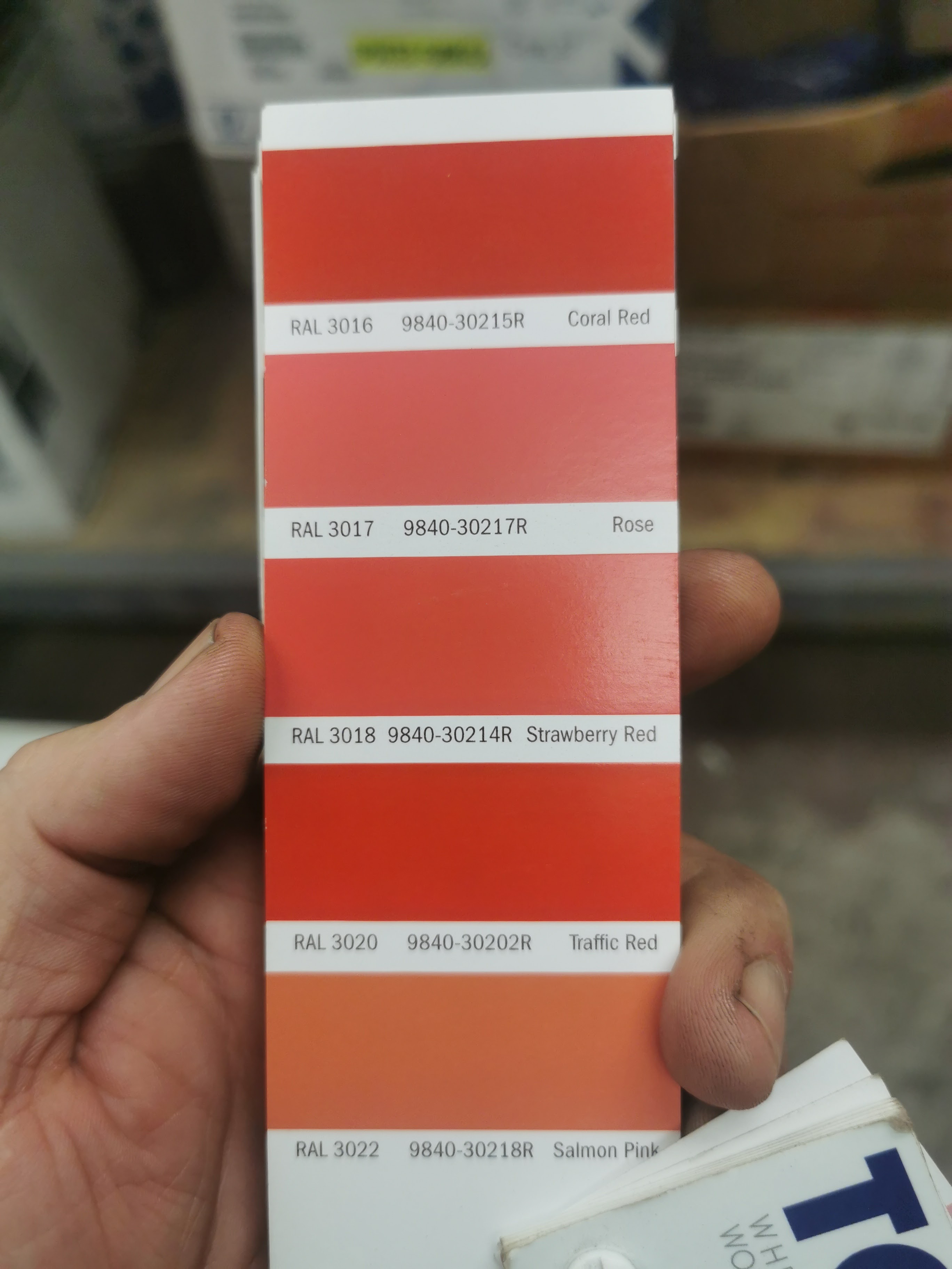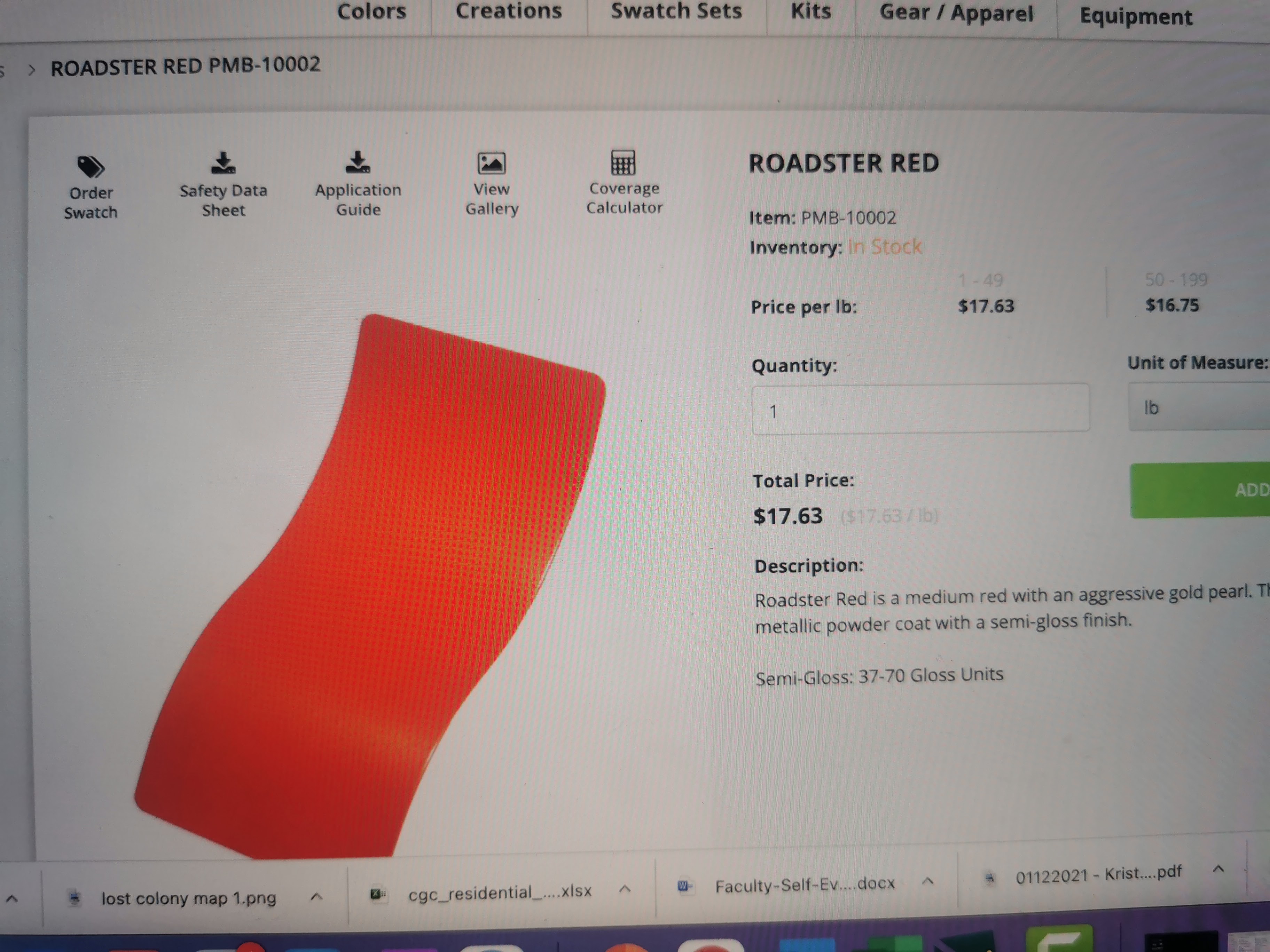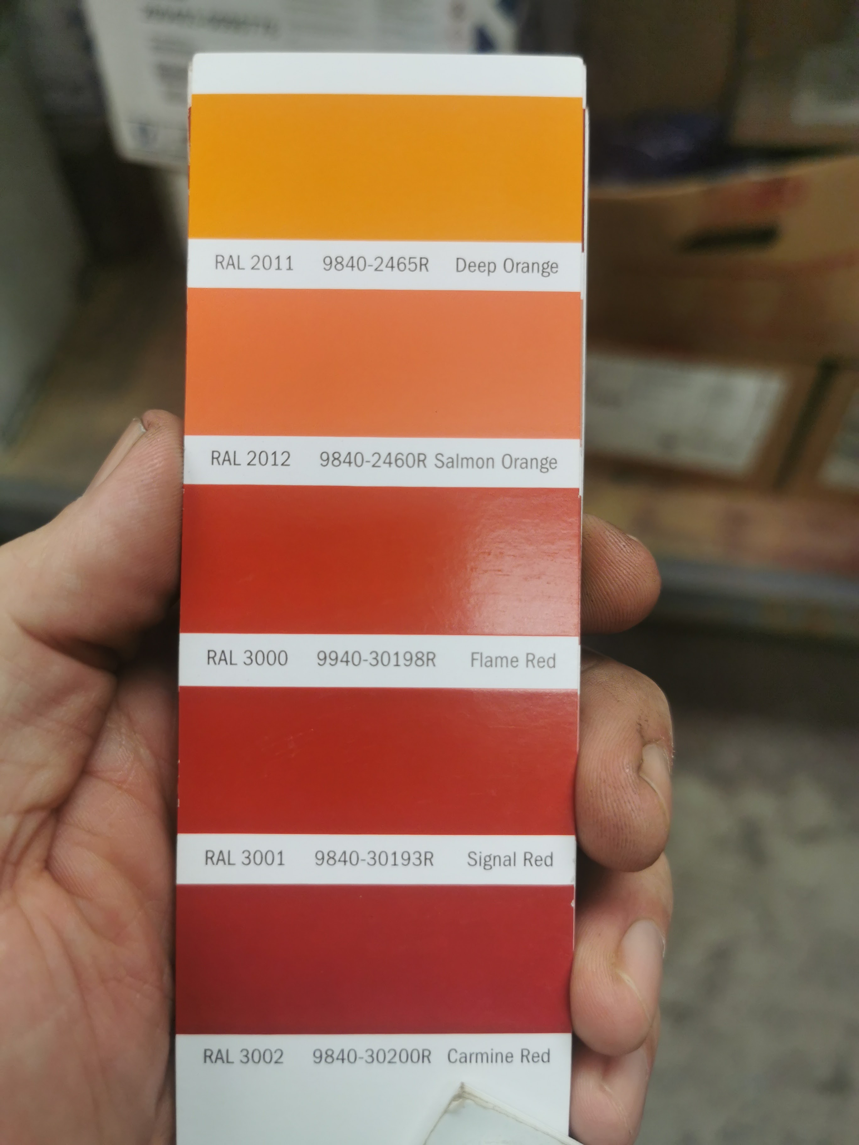 Holding the swatch up against the frame at the paint shop I went with Vermillion, one of the TCI Powder Coating colors. The guy at D&B Custom Powder Coating in Trenton had it back to me in a week. Nice paint job, but the color of the frame is decidedly more pink/orange than the original color, I think. It’s close, but I’d rather have had a shade more red than the original than a shade more on the coral side.
