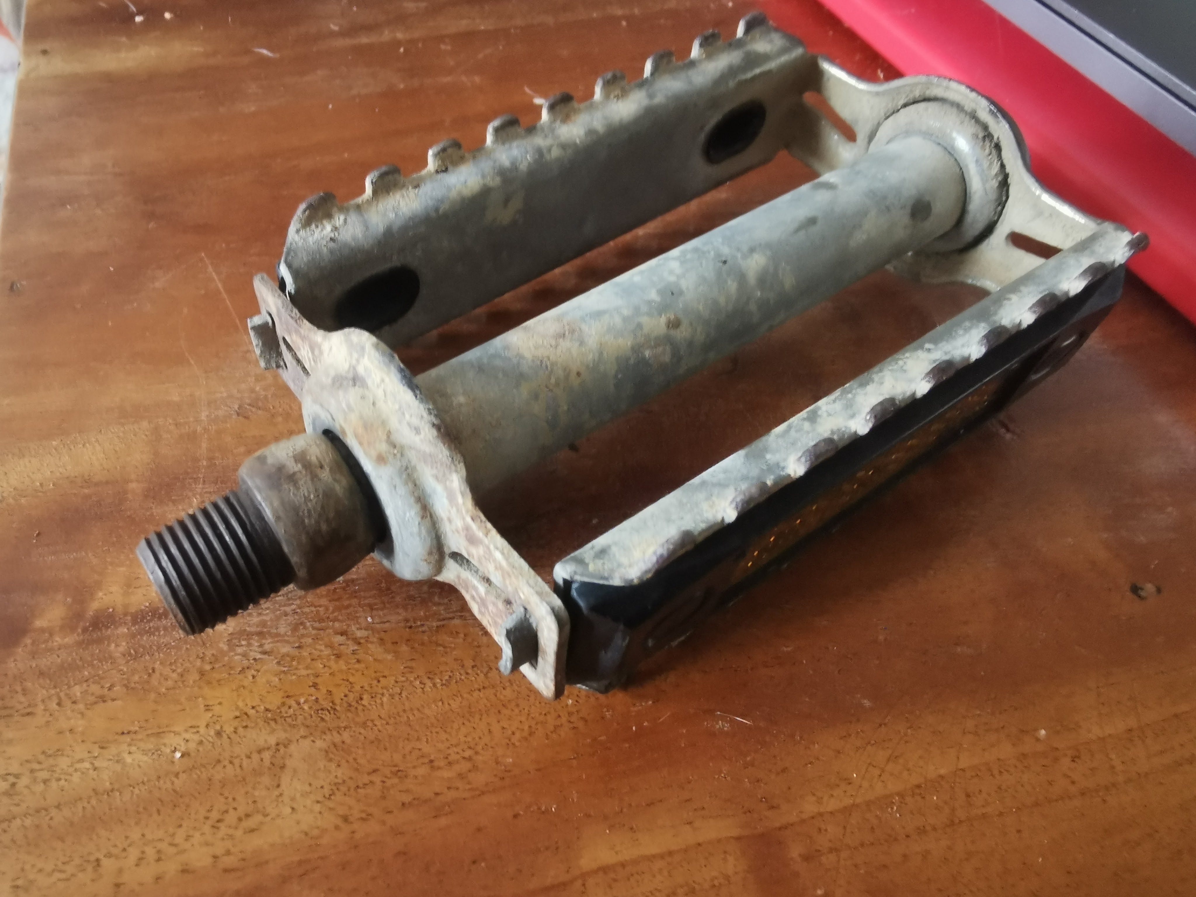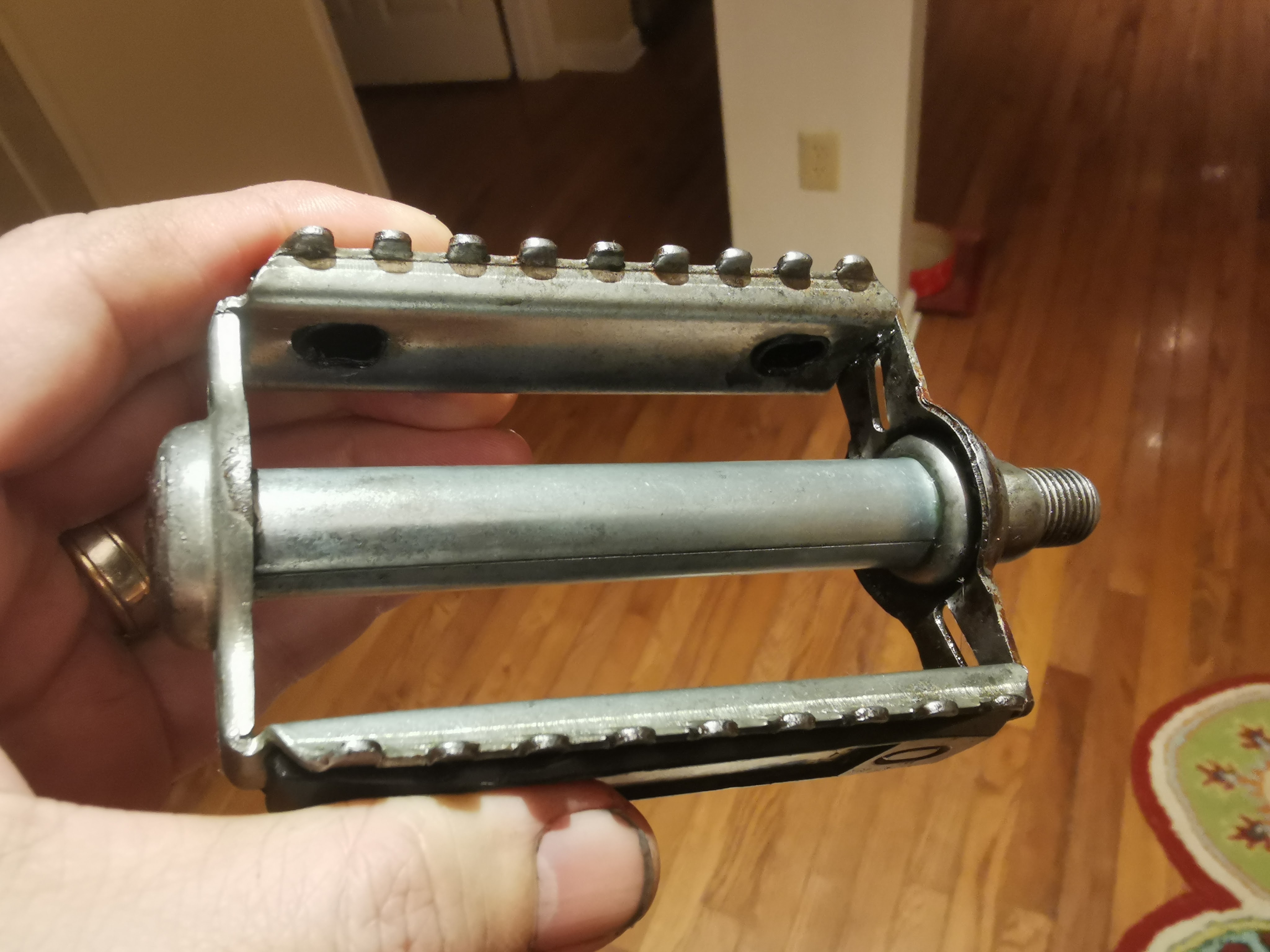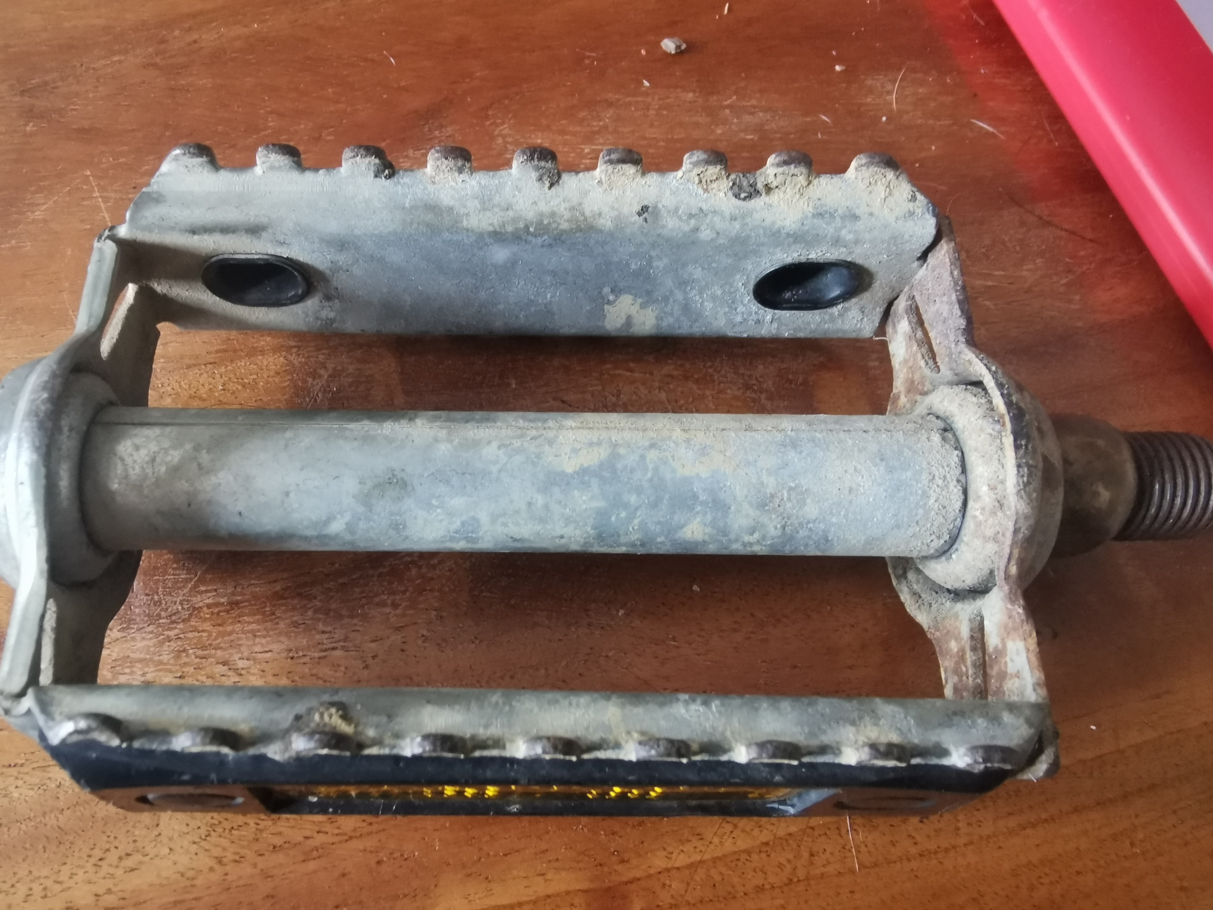 Here are the pedals after they are cleaned on on the bike. Not only are they cleaner, but I repacked the bearings and they spin so much more smoothly now. I was actually resigned to getting new pedals but then decided since I’d stuck with the original color that I may as well just try to keep the entire bike original, excepting the consumables.