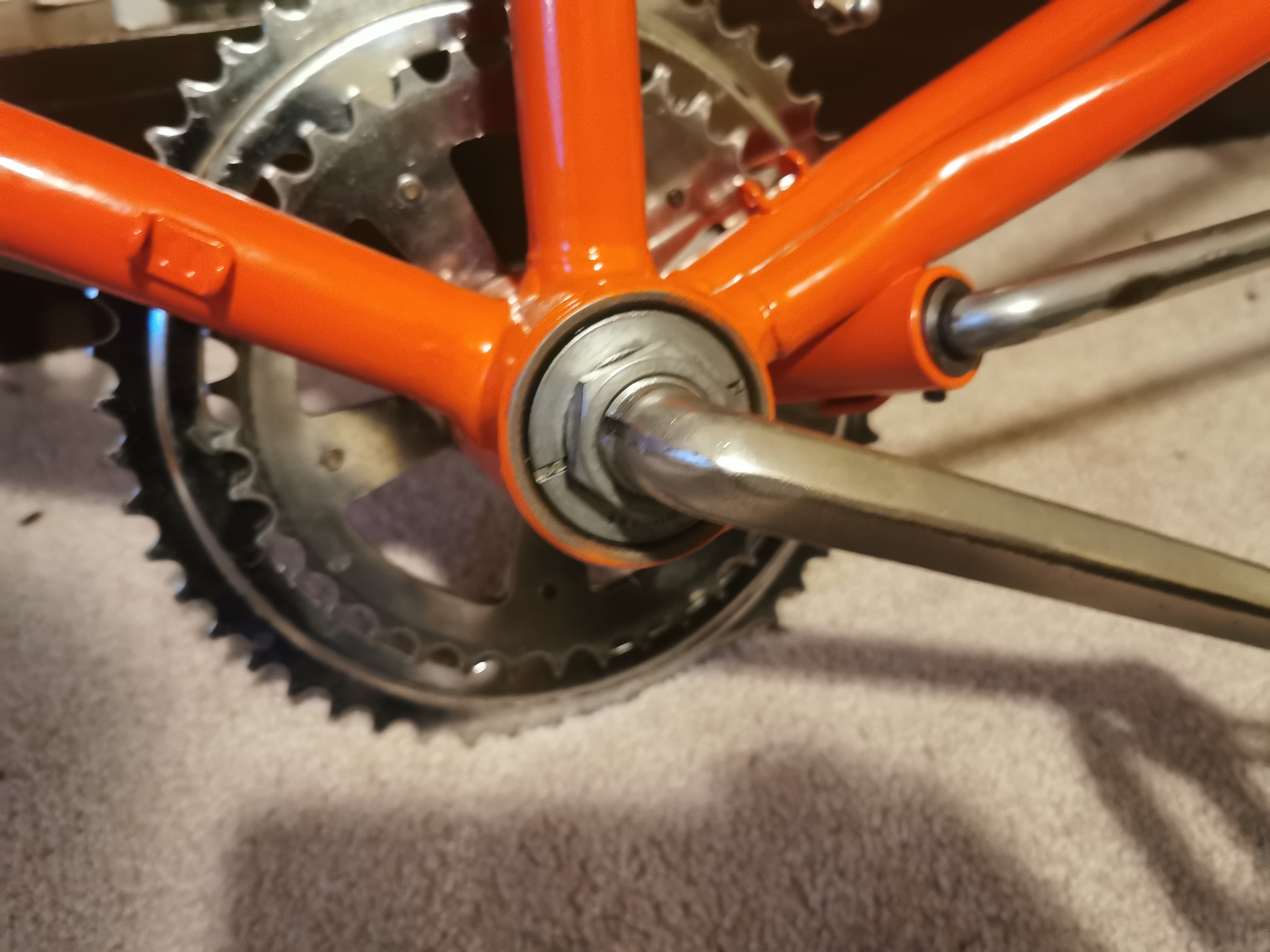 I’d cleaned many of the parts by the time I got the frame back, so I took it to the front porch and started putting it back together. I really need a bike stand, the porch swing isn’t too stable. But it was here that I repacked the bottom bracket. Wasn’t nearly as complicated as I thought it would be. I restored my old Bianchi a few years back but I think I took it to the bike shop and had them either repack it for me or replace it with a sealed cartridge. Can’t remember. Anyway, it’s now super smooth. And clean.