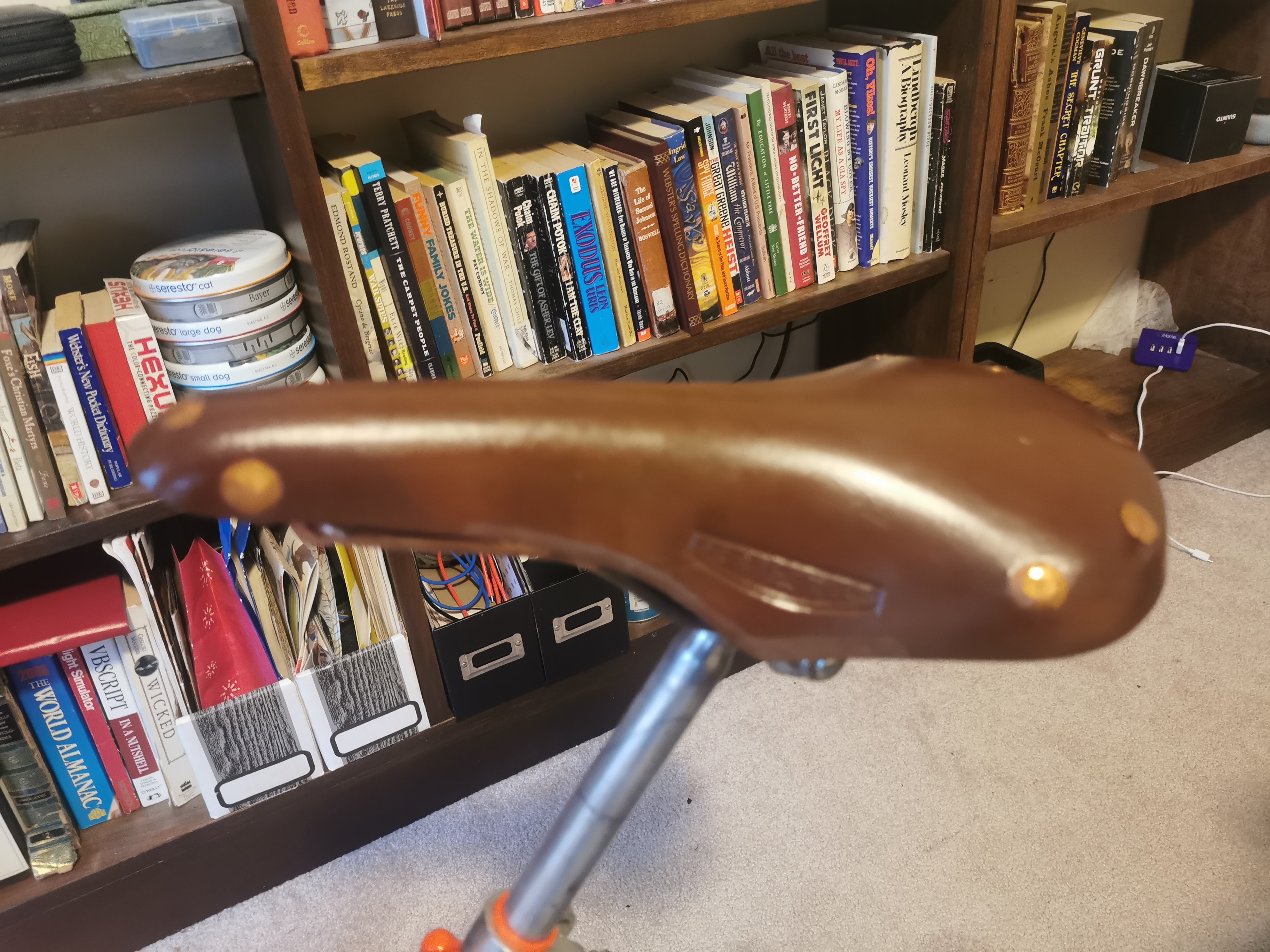And for the seat, I actually tried to clean up the original seat but it was bent underneath, making it look like a banana if I am looking down at it from over the bike. I considered getting another black seat but wanted to go with brown, and also considered going with a more expensive Brooks saddle, but settled for a Persons saddle – new, old stock – for about half the cost of a Brooks saddle.
