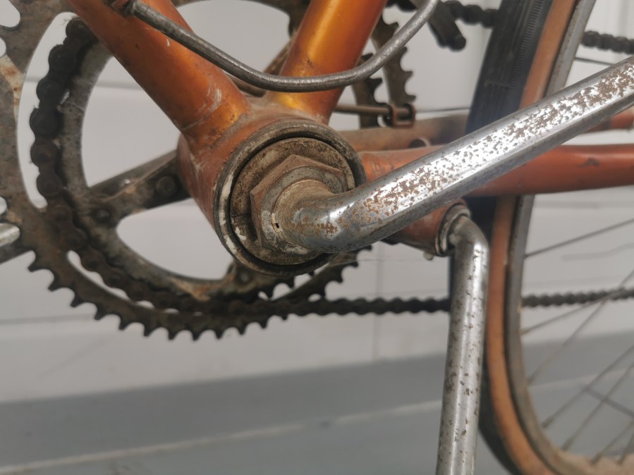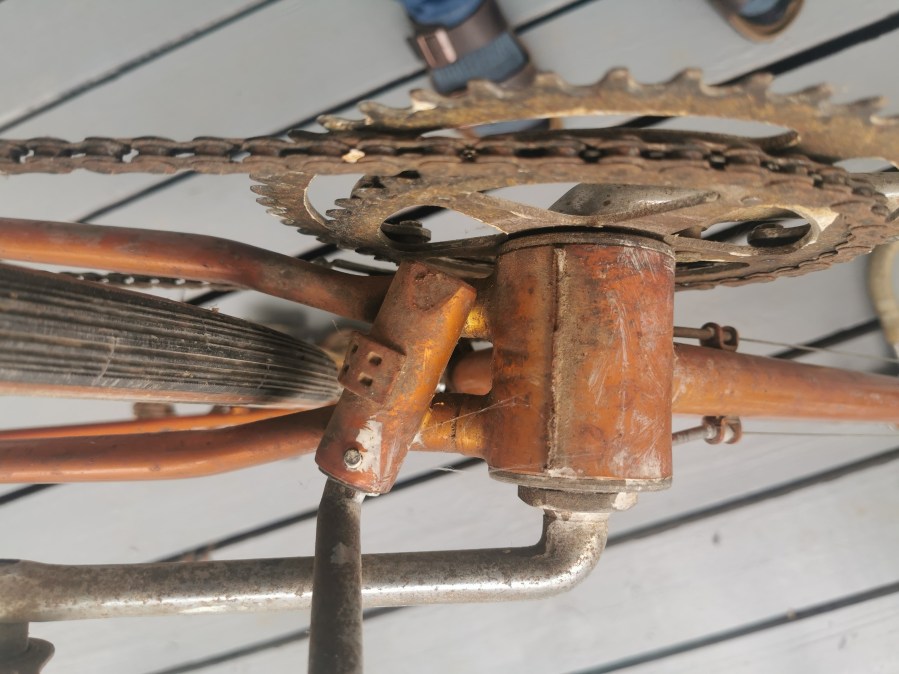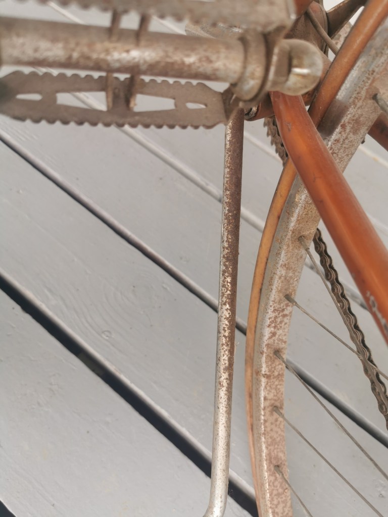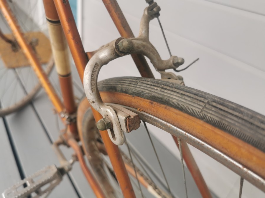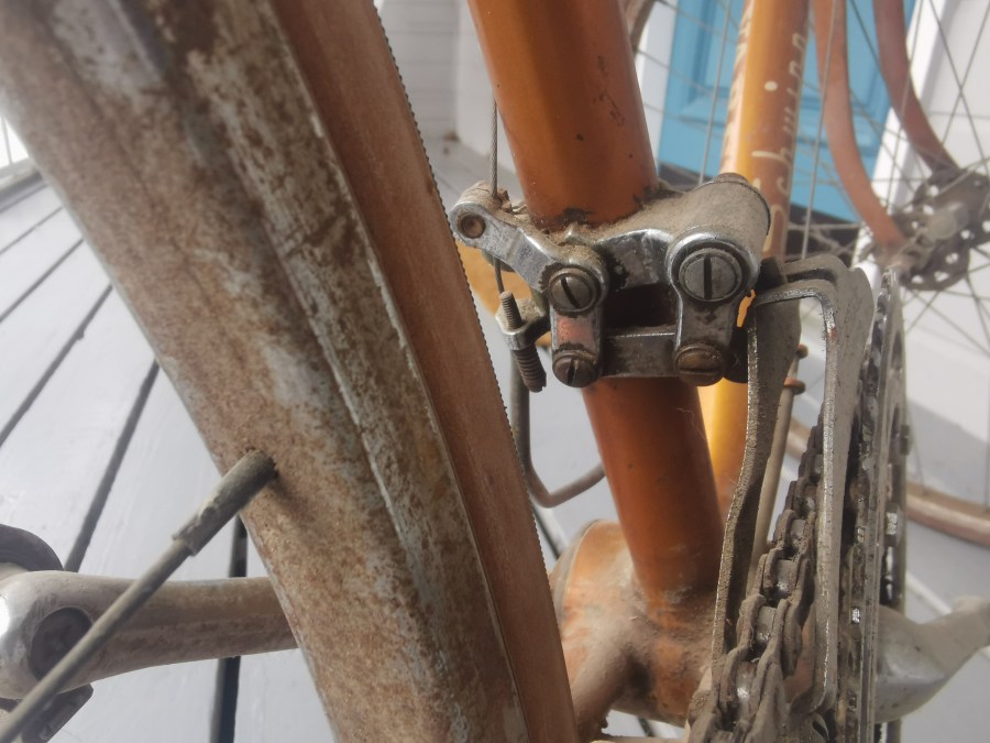 The saddle is French and is called a Sprint saddle. It is a Brooks racing saddle lookalike, and it’s so cool. I’m going to try to restore it. And it came with a small saddle pouch on the back of the seat that I’ll try to restore. Other than new tubes, tires, handlebar tape, paint, cables, and maybe brake pads I don’t think much else will need to be replaced. Most everything is in great shape.