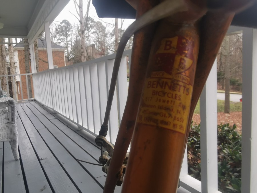 So I found this on in an online ad late on Saturday night and sent the seller a query. She still had it, and yes, it would fit someone my size. So I left the house the next morning at 7:30 and got to her place in North Georgia around 9:30. Maureen didn’t know much about the bike but told me that, for sure, her husband had been the only owner of this bike. She wasn’t sure what year it is – she was guessing mid-1960s – but that he’d bought it with his own money when he was 12 or 14. Her husband, Robert “Bob” Petersen, died in May of 2020. Bob had owned this bike since he rolled it out of Bennetts Bicycles on 517 Jewett Ave., on Staten Island, NY; Bob and Maureen were both from Staten Island. I found the bike’s serial number and checked online for the model year. Turns out it was produced on August 24, 1964, so Bob (perhaps Bobby at that age?) would have been about 12 years old. Maureen told me he was born in 1952. She told me he had ridden this bike all his life and that it was well used. But now that Bob had passed away, at the age of 68, she had decided to move to a place where she had a smaller house and less land. She’s moving to the coast.